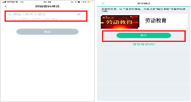未登录过的同学在学号登录、验证姓氏、绑定手机号、修改初始密码后,会弹出课程确认的界面,点击确认即可。