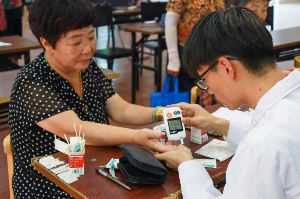 在实践队员的安排指导下,义诊场面和谐有序,老年人热情乐观,积极配合,脸上洋溢着笑容。实践队员们通过中西医相结合的方式帮助老人们发现与缓解病痛。在“望、闻、问、切”等传统中医方式问诊后,队员们分工给老人量血压、测血糖,操作行云流水,配合熟练,系臂带、倾听血压、酒精消毒、打采血针动作一气呵成;袅袅艾香中可以看到推拿艾灸的队员以回旋灸、温和灸的灸法尽心帮助老人缓解疼痛,同时细心询问老人病情以及疼痛部位,普及生活中的医学知识,来消磨闲暇的时光。实践队员积极询问老年人的生活习惯、身体状况,耐心回答老人们的各种疑惑问题,系统整合与分析,给出合理建议,帮助老年人改善健康状况。