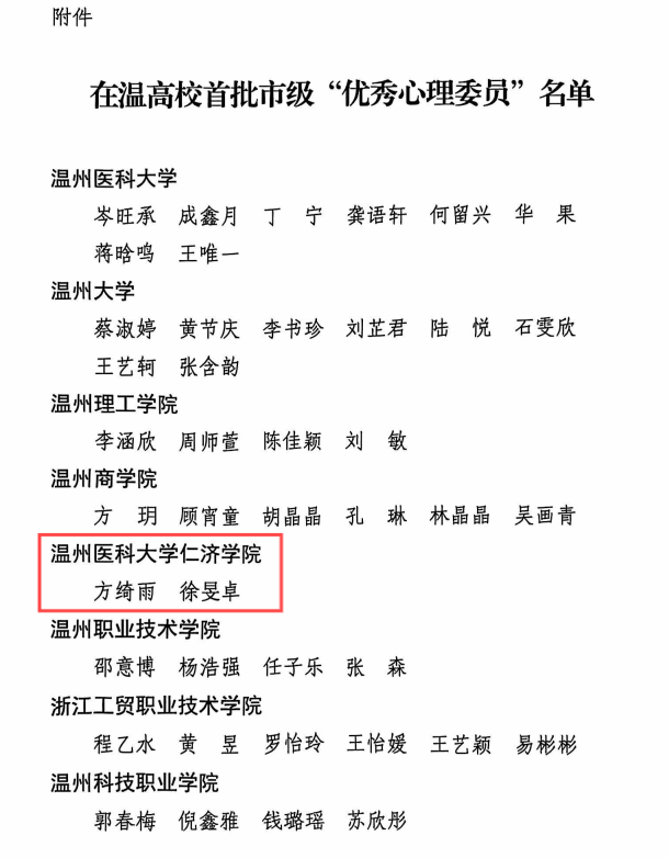 近日, 中共温州市委教育工作委员会公布在温高校首批市级“优秀心理委员”名单,公司22全科8班方绮雨、22麻醉徐旻卓两位同学凭借出色的工作表现和显著的服务成效成功入选。
