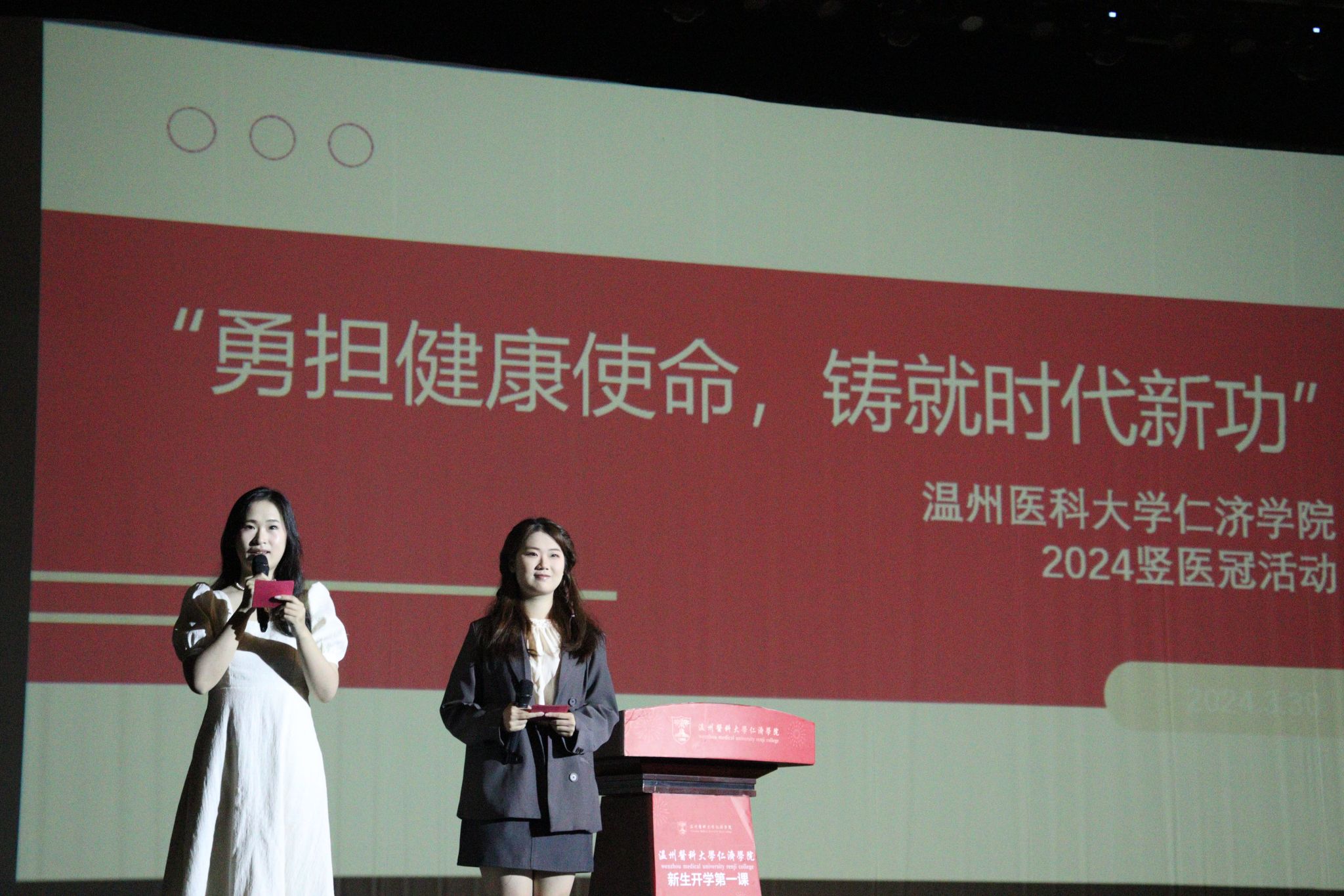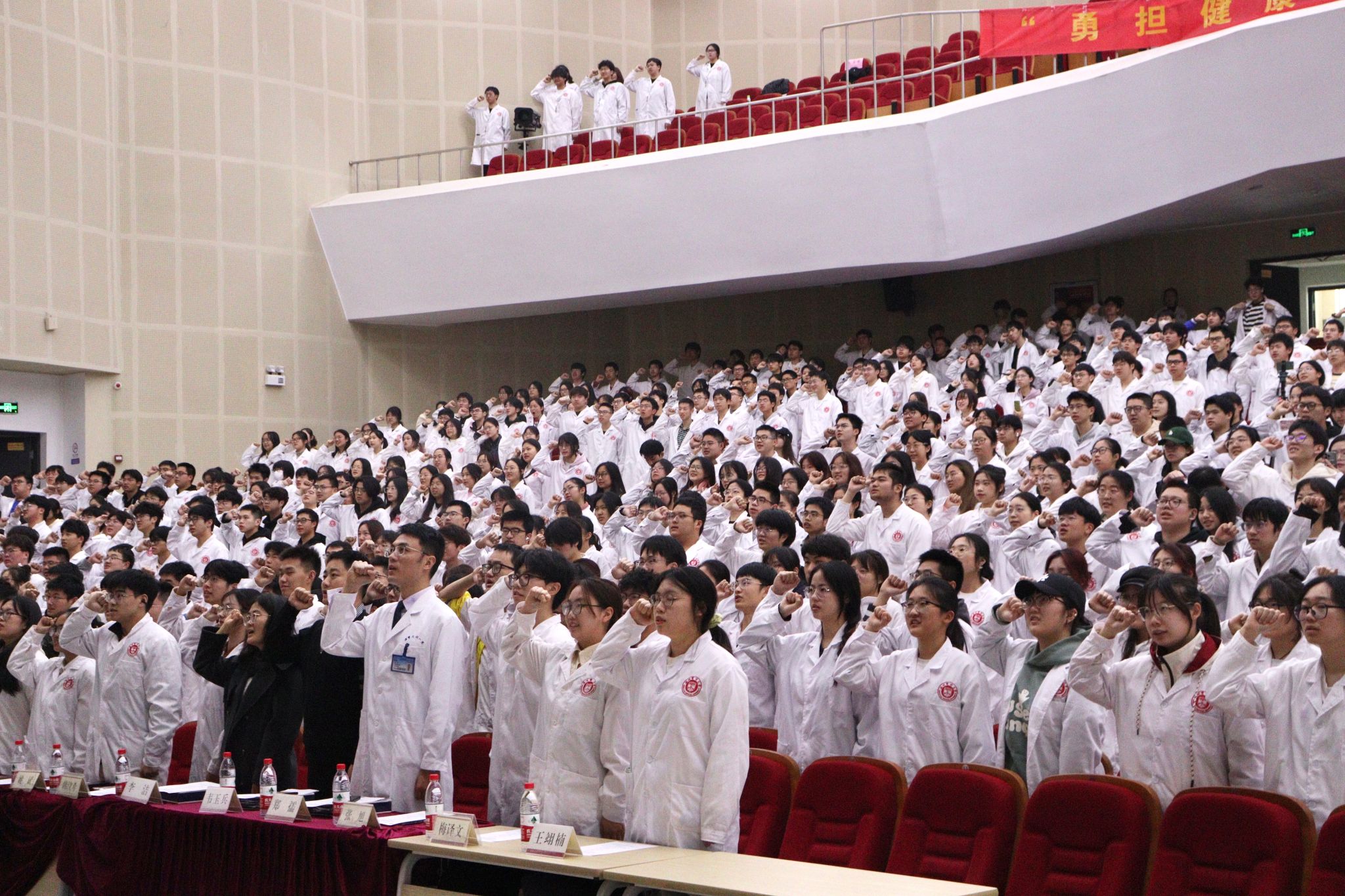 随后,活动来到白大褂授予仪式和医员工宣誓誓词。员工代表从郑孺医生手中接过神圣高洁的白大褂,郑孺医生为其整理衣冠,在此过程中,新生们感受到前辈的殷殷期盼,这是行医路上责任感的传承。而后,新生们在三位领誓人的带领下,整齐划一地举起右拳,“健康所系,性命相托!”铿锵有力的声音响彻会堂,展现出新生们对医学事业的无限憧憬与敬仰,彰显出他们将坚定使命、不忘初心的决心,也逐渐增强在座同学对于医疗工作者的身份认同,而这种认同感将成为他们在未来职业生涯中不断前进的动力源泉。