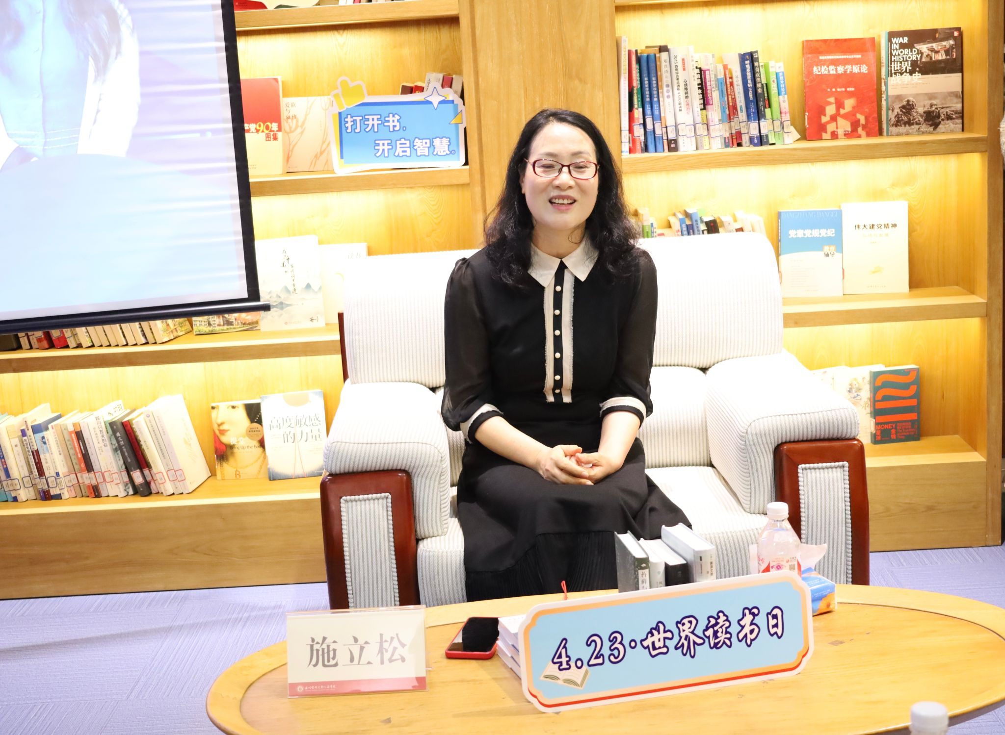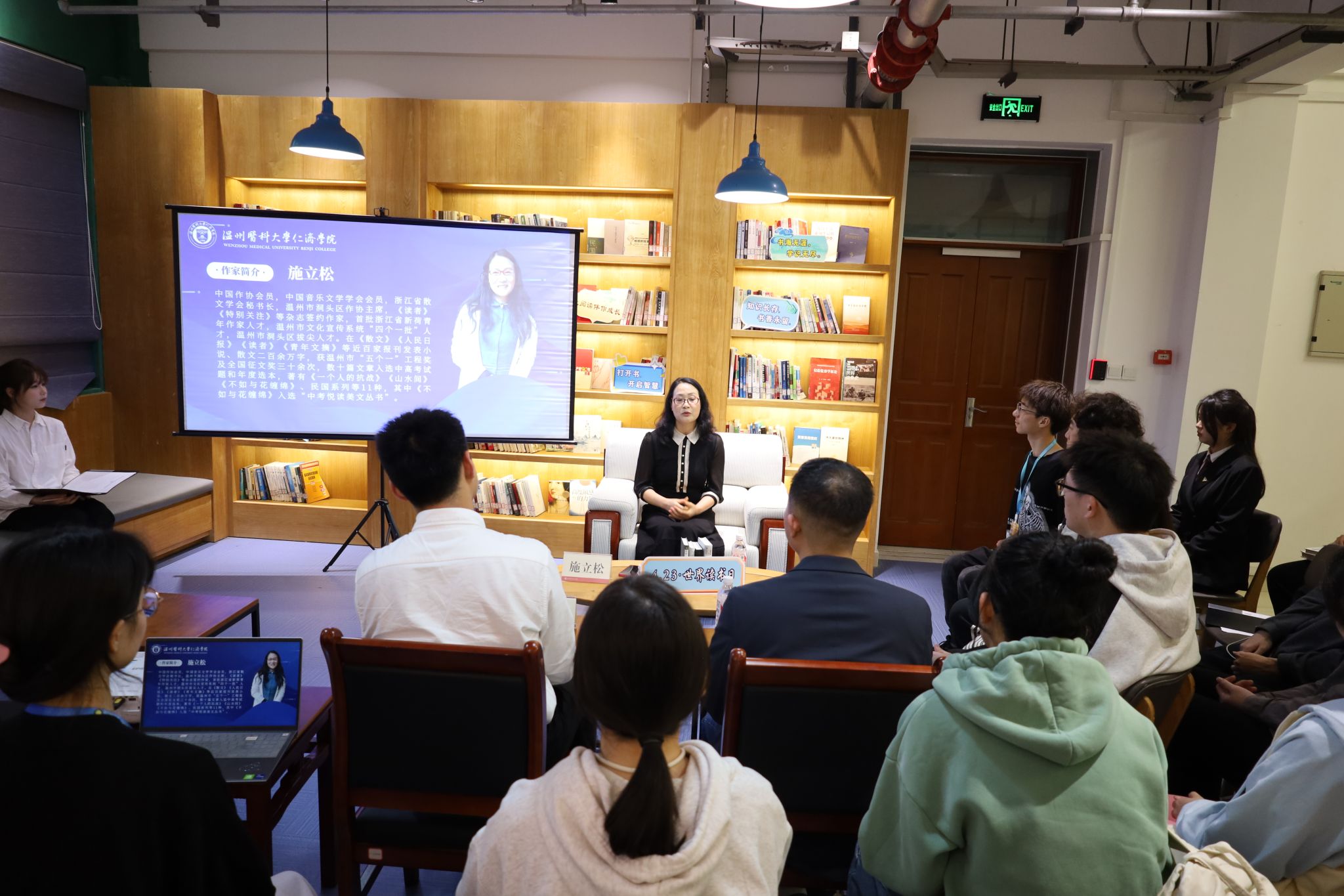 活动中,施立松老师以其独特的视角和感人的经历,深情讲述了她从医学领域跨界到文学的转变之路,并分享了阅读如何深刻影响她的人生轨迹。她坦言:“尽管我的职业生涯始于医学,但是阅读引领我步入了文学的殿堂。在温州医公司的学习生涯和医院工作中,我始终珍视阅读时光,是那些书籍为我打开了新世界的大门,让我领略到了医学之外的广阔天地。”施老师还回忆了她在洞头海边,伴随着海浪声沉浸于书海的时光,分享了她如何从中汲取力量,找到内心的宁静与成长的动力。她鼓励在场的每一位同学,不论未来走向何方,都不应忘记阅读的力量和它所带来的深远影响。