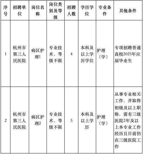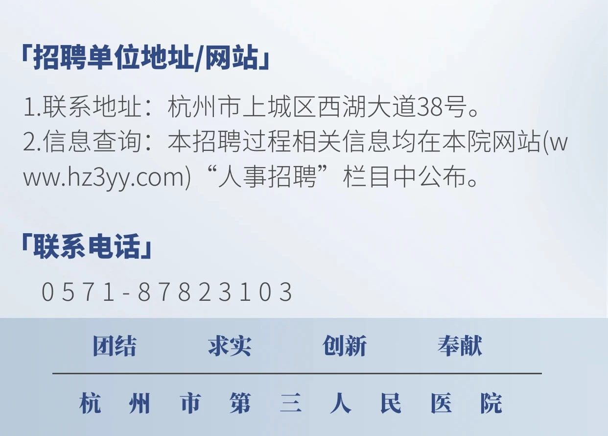 再次温馨提示!2025年上半年杭州市第三人民医院公开招聘工作人员公告杭州市第三人民医院是杭州市卫生健康委员会直属的事业单位,是一家具有专科特色的市属三级甲等医院。因医院业务发展需要,因工作需要,决定面向社会公开招聘事业编制工作人员9名。依据《事业单位人事管理条例》(国务院令第652号)、《关于贯彻落实国家人事部〈事业单位公开招聘人员暂行规定〉的实施办法》(杭人政〔2006〕5号)和《杭州市事业单位公开招聘工作人员操作程序(试行)》(杭人社发〔2014〕380号)等文件规定,现将有关事项公告如下:4.具有岗位所需的专业学历、专业理论知识和学历相匹配的实践操作能力。1.博士研究生学历学位或副高及以上职称者,年龄在45周岁以下(1979年1月1日以后出生);正高职称者,年龄在50周岁以下(1974年1月1日以后出生);特别优秀者,年龄可适当放宽。2.其他人员35周岁以下(1989年1月1日以后出生)。3.有关资格条件或工作经历的计算,截止时间为2025年6月30日。1.部分岗位专项招聘普通高校2025年应届毕业生,具体包含以下对象:①2023年、2024年和2025年普通高校毕业生,含同期毕业的留学回国人员,以及符合教研厅函〔2019〕1号文规定的非全日制研究生;②按国家政策规定可以享受应届毕业生就业待遇的其他情形人员。2025年普通高校毕业生取得相应证书的时限为2025年9月30日前。2.关于“两个同等对待”:医疗卫生机构面向社会招收的住院医师如为普通高校应届毕业生的,其住培合格当年在医疗卫生机构就业,按当年应届毕业生同等对待。经住培合格的本科学历临床医师,按临床医学、口腔医学、中医学专业学位硕士研究生同等对待(住培合格证书中的培训专业原则上应当与招聘岗位的专业或类别要求相一致)。时间:2025年1月15日9时—2025年2月11日17时。报考人员登录杭州市卫生健康系统公开招聘服务系统(https://gkzp.wsjkw.hangzhou.gov.cn:30004/rczp-admin/web/account_info/toLogin.html)注册个人基本信息,上传本人的电子照片(近期免冠、正面证件照,jpg格式,照片为30k以内,不大于128*180像素,不小于80*110像素),填写应聘报名表,并完成诚信确认。2025年1月16日9时—2025年2月11日17时,报考人员可在报名系统查询报名不足1∶8比例的岗位,报名系统每30分钟自动更新数据1次。在报名期间报考人员可更改报考岗位,各招聘单位暂不作初审。时间:2025年2月12日9时—2025年2月13日17时。招聘单位对报考人员最后选定的岗位进行资格初审,资格审查条件由招聘单位及其主管部门负责解释。对资格初审未通过人员将网上反馈并说明理由。在此期间,报名系统不对考生开放。2025年2月14日在杭州市卫生健康委员会网站(http://wsjkw.hangzhou.gov.cn/)上公布不开考岗位和核减岗位情况。对有效报考人数不足招聘计划3倍的岗位(招聘人数在10人及以上的岗位不足招聘计划2倍)不开考或酌情核减招聘计划。时间:2025年2月15日9时—2025年2月17日17时。已注册报名人员登陆杭州市卫生健康系统公开招聘服务系统(https://gkzp.wsjkw.hangzhou.gov.cn:30004/rczp-admin/web/account_info/toLogin.html)查询资格初审结果。通过资格初审的,不能再报考其他岗位;不开考岗位报考人员和资格初审未通过人员可进行网上改报并接受资格初审,改报截止时间为2025年2月17日17时。改报的资格初审时间至2025年2月18日12时结束。未及时改报者视为自动放弃报考。时间:2025年2月19日—2025年2月22日。考生在规定时间登录杭州市卫生健康系统公开招聘服务系统(https://gkzp.wsjkw.hangzhou.gov.cn:30004/rczp-admin/web/account_info/toLogin.html)下载并打印准考证及报考须知。考试采用笔试、实践技能测试和面试(笔试、实践技能测试和面试成绩各占40%、30%和30%)方式进行。考试成绩按100分制计算,60分为合格线。笔试内容为本招聘岗位专业知识。考试时间为2025年2月22日9∶00—11∶00。报考人员必须凭准考证和有效期内的身份证(两证缺一不可)按准考证上规定的考点、考场和时间参加笔试。笔试结束后,在笔试成绩合格人员中(笔试成绩按100分制计算,60分为合格线),从高分到低分按岗位招聘计划1∶4的比例(招聘人数在10人及以上的岗位1∶2的比例)确定参加实践技能测试和面试对象。如不足规定比例的,将实际笔试成绩合格人员确定为参加实践技能测试和面试对象。笔试存在违纪情况的,不得入围实践技能测试和面试。2025年2月28日在杭州市卫生健康委员会网站(http://wsjkw.hangzhou.gov.cn/)上公布实践技能测试和面试入围人员名单,考生本人可登陆杭州市卫生健康系统公开招聘服务系统(https://gkzp.wsjkw.hangzhou.gov.cn:30004/rczp-admin/web/account_info/toLogin.html)查询笔试成绩。实践技能测试和面试实施前,实践技能测试和面试入围人员按招聘单位指定的时间、地点进行现场资格复审。应聘者需提供以下材料的复印件:普通高校2025年应届毕业生应提供:报名表、公司核发的含有成绩单的就业推荐表、普通高校毕业生就业协议书、身份证、个人荣誉证书等相关证件(证明)原件及复印件;其他人员应提供:报名表、本人身份证、户口簿、学历、学位证书、专业技术资格证书、执业资格证书、注册证书、工作经历证明[以劳动(聘用)合同或社保缴费记录为准]、获奖证书等相关证件(证明)原件及复印件;留学人员还应提供教育部中国留学服务中心出具的国(境)外学历学位认证书。证件(证明)不全或所提供的证